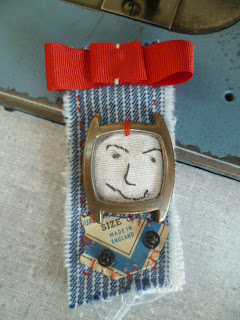 This brooch was inspired by the old watch face I found. I was going to stitch a cat but when I started sewing the eyes I thought they looked like eyebrows and then this little man appeared. He made me laugh. I would have liked to have stitched 'watch it kid' as this is what Dad used to say to us if we were about to get in trouble but that would have taken too long so I stitched Hi underneath the watch.